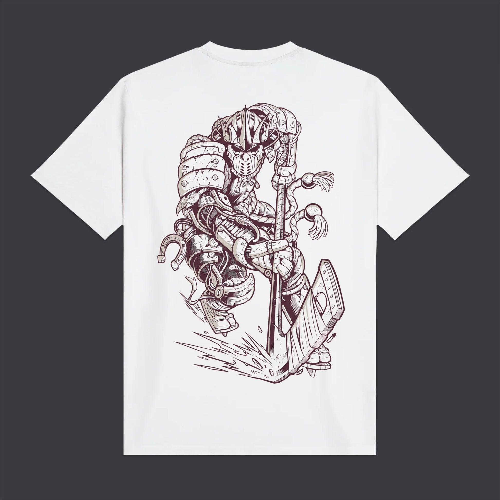 DOLLY NOIRE - BLUR Hockey Cyborg Tee White: t-shirt streetwear bianca in 100% cotone, vestibilità regolare e serigrafia fronte/retro. Il giocatore di hockey DLYNR si “cyborgizza” e si fonde con un’estetica giapponese fatta di simboli, disciplina e tensione: un incontro tra ghiaccio e tradizione.